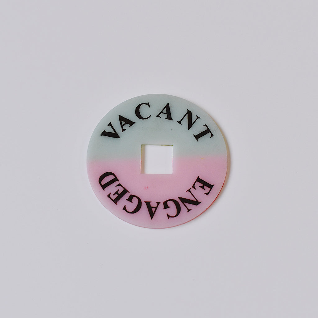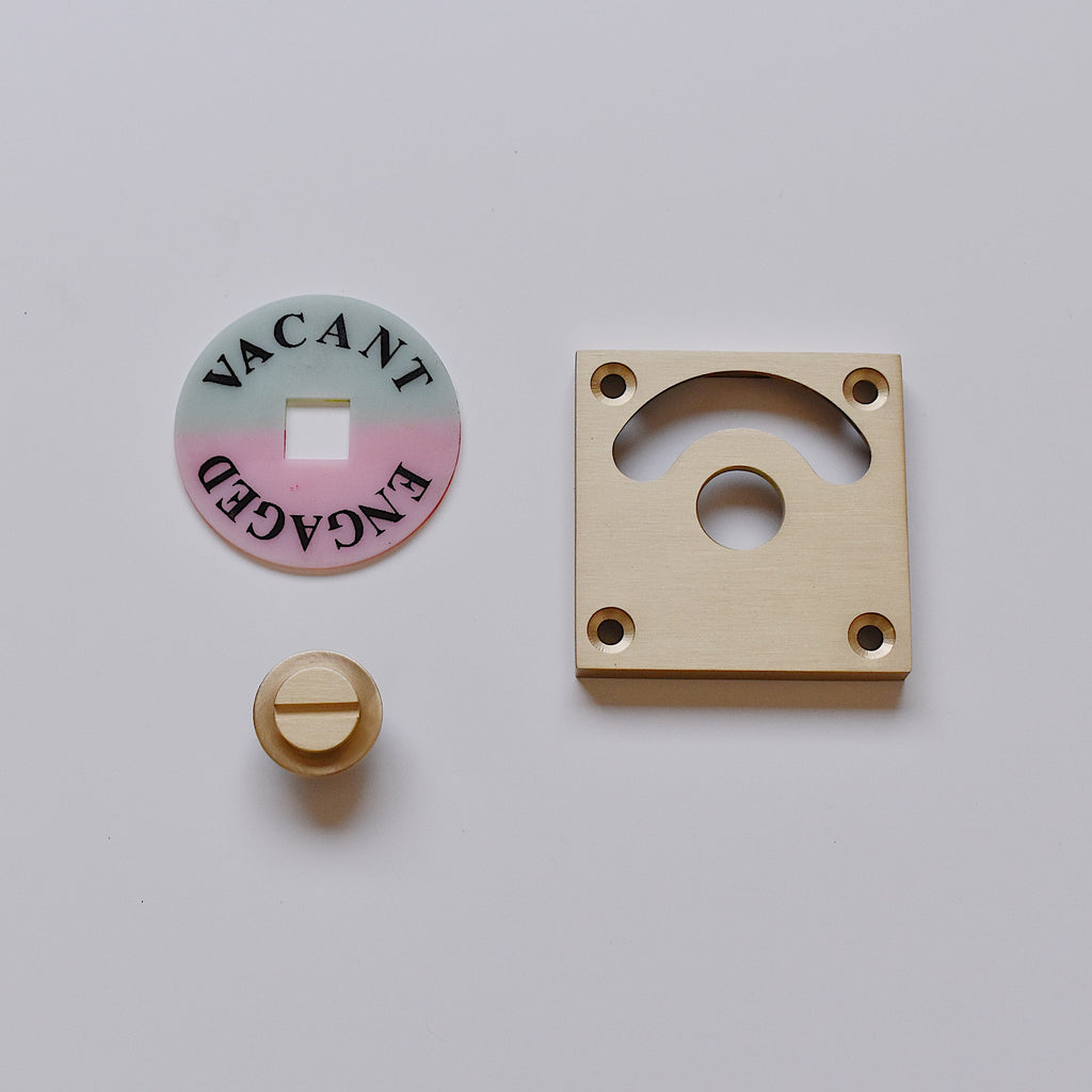 部屋の中から鍵をスライドさせると、プレートに印字されたVACANT(空室)・ ENGAGED(使用中)が室外側に表示される構造になっています。またプレートを裏返すと緑・赤の表示にすることも可能です。視覚的にも分かり易いのでこちらもオススメです。